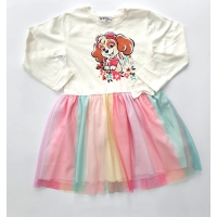 Sukienka z długim rękawem, zdobiona kolorową aplikacją z przodu. U dołu tiulowa falbanka.